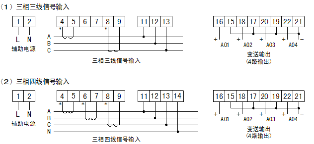 輸入三相電壓、電流信號,隔離變送輸出四路模擬量信號,對應有功功率、無功功率和其它電量可選。