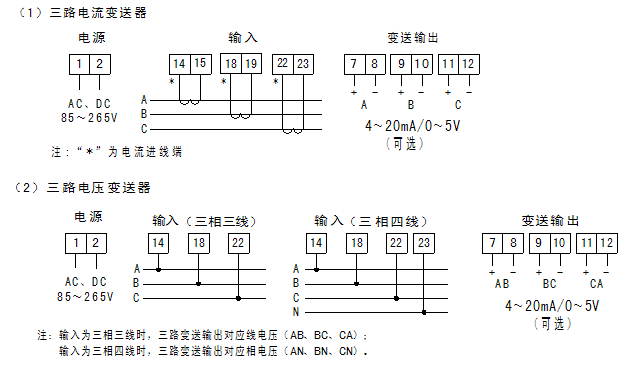 測量三相電流、電壓信號,隔離變送輸出三路電流信號或三路電壓信號。